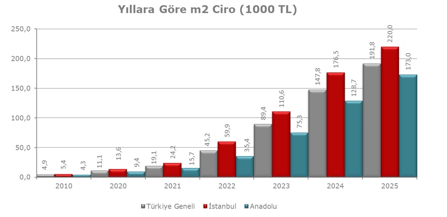Metrekare başına düşen toplam ciro Türkiye genelinde yüzde 30 artarak 191.803 TL seviyesine ulaştı. Bu veri, yalnızca toplam cirodaki artışı değil, aynı zamanda alan verimliliğinde de güçlü bir performans olduğunu ortaya koyuyor.