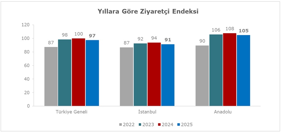 Ciro tarafındaki güçlü artışa karşın, ziyaretçi sayısı endeksinde %3’lük bir düşüş gözlendi. Bu tablo, harcama davranışında bir değişime işaret ediyor olabilir. Daha az ziyaretle daha yüksek ciro üretilmesi; ortalama sepet tutarındaki artış, fiyat etkisi veya tüketicinin daha planlı alışveriş davranışıyla açıklanabilir.
